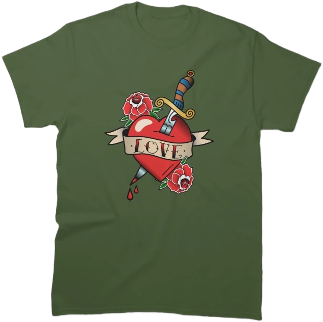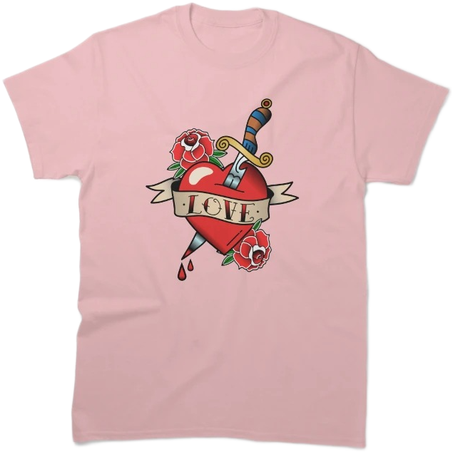 This striking design features a bold red heart pierced by a dagger, surrounded by blooming roses and the powerful word “LOVE”
